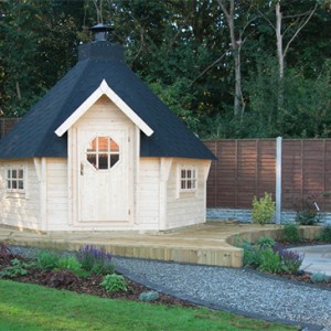 The client wanted a barbecue lodge so this was positioned on decking with lighting.