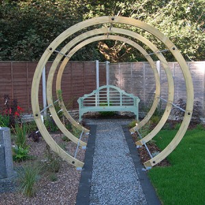 The path curved round to a circular patio surrounded by planting.